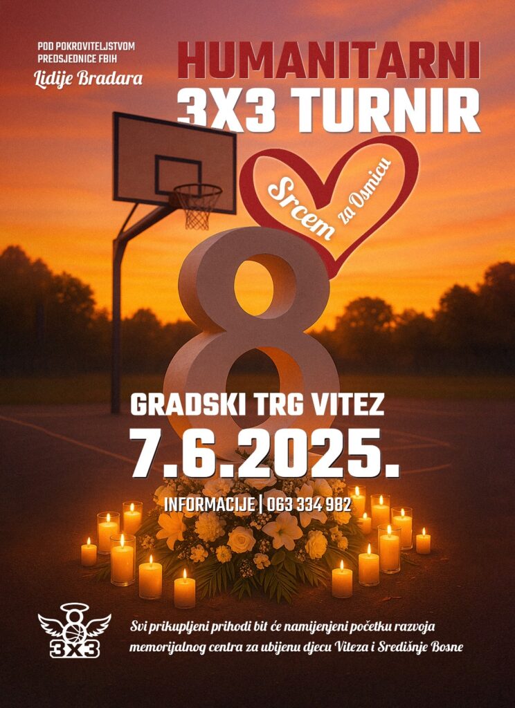 Udruga za čuvanje sjećanja na djecu žrtve rata „Osmica“ Vitez, pod pokroviteljstvom predsjednice Federacije BiH Lidije Bradara, pokreće humanitarnu akciju s ciljem početka izgradnje i razvoja memorijalnog centra posvećenog ubijenoj djeci Viteza i Središnje Bosne. Prva aktivnost u sklopu ove inicijative je humanitarni košarkaški turnir 3x3 za dječake do 14 godina, koji će se održati u petak, 7. lipnja na Gradskom trgu u Vitezu, u suradnji s Omladinskim košarkaškim klubom "Vitez".